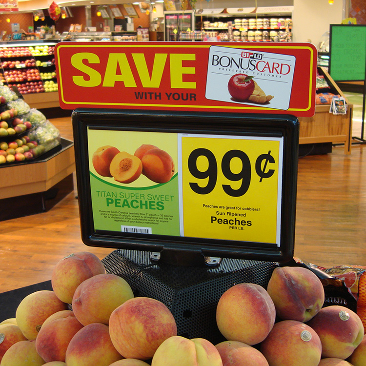 - Easel base is ideal for cases, tables, stacked displays or boxed products