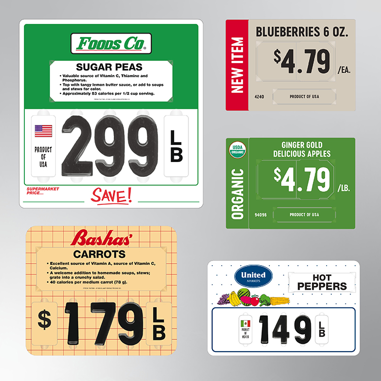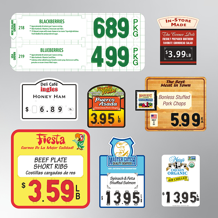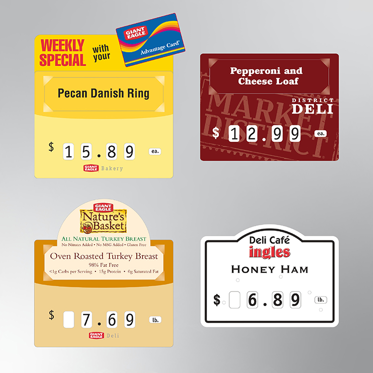 As a pioneer in price tag manufacturing with over 100 years of experience, we offer a versatile range of shapes and sizes to boost your sales by enhancing your displays. Most of our price tags are made from rigid vinyl and hot-laminated for superior durability. They are made to withstand the variable environmental conditions found in both service and self-service cases, where they are exposed to frigid temperatures, water, food oils and cleaning chemicals.