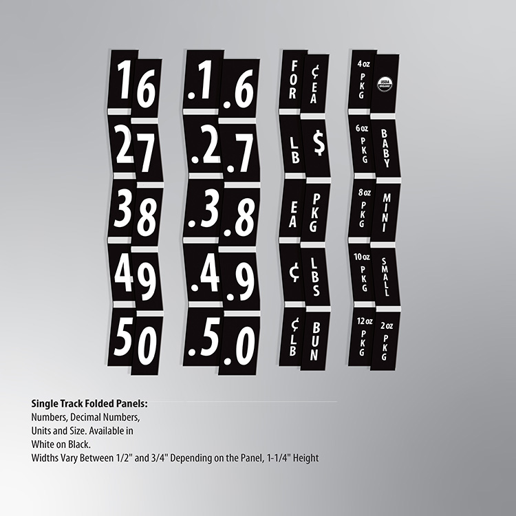 Our Just Pic’d™ folded number panels are designed for efficiency and clarity, making price changes quick and seamless. Printed in reverse black on all-plastic accordion-style strips, these panels contain all essential pricing elements—regular numbers, decimals, unit panels, and our unique “Size” panel—on a single strip, eliminating the need to manage multiple parts.