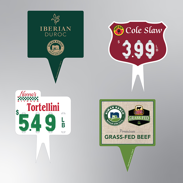 Spear Tags are the perfect signage solution for service cases, eliminating the need for additional attachments or accessories. Printed on food-safe, rigid vinyl and laminated for durability, these vibrant tags can be customized in any shape or size to suit your branding and merchandising needs.
