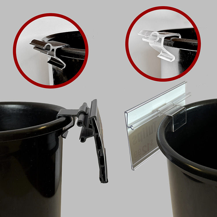 Upgrade your floral merchandising with the View-Lok™ Model PFC-E30 Plastic Floral Clip, offering secure, adjustable, and visually appealing signage for your floral bucket displays.